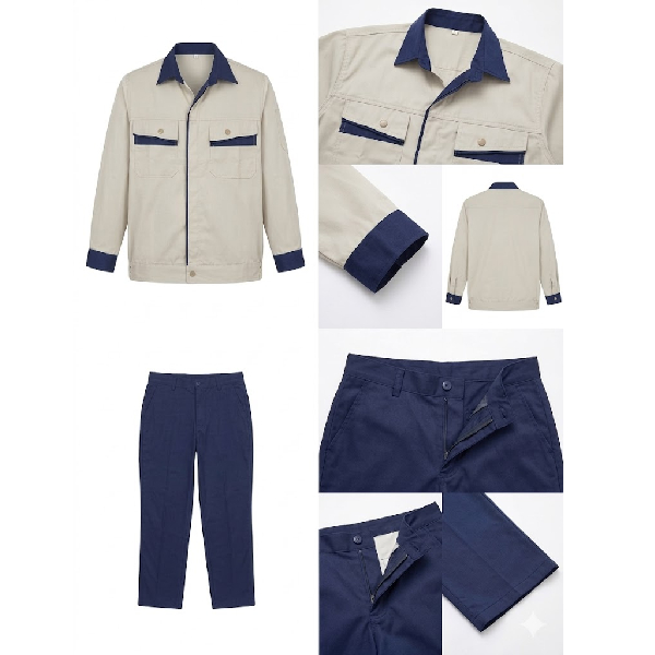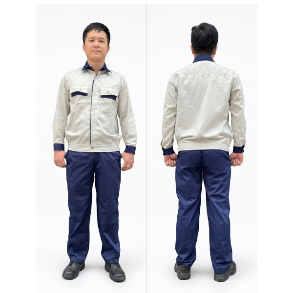 | Thiết kế phối màu | Sự kết hợp độc đáo giữa Ghi sáng chủ đạo và điểm nhấn Xanh tím than ở cổ áo, nắp túi và cửa tay. Cách phối màu này không chỉ tạo chiều sâu cho bộ trang phục mà còn giúp che đi các vết bẩn dầu mỡ trong quá trình làm việc. |
